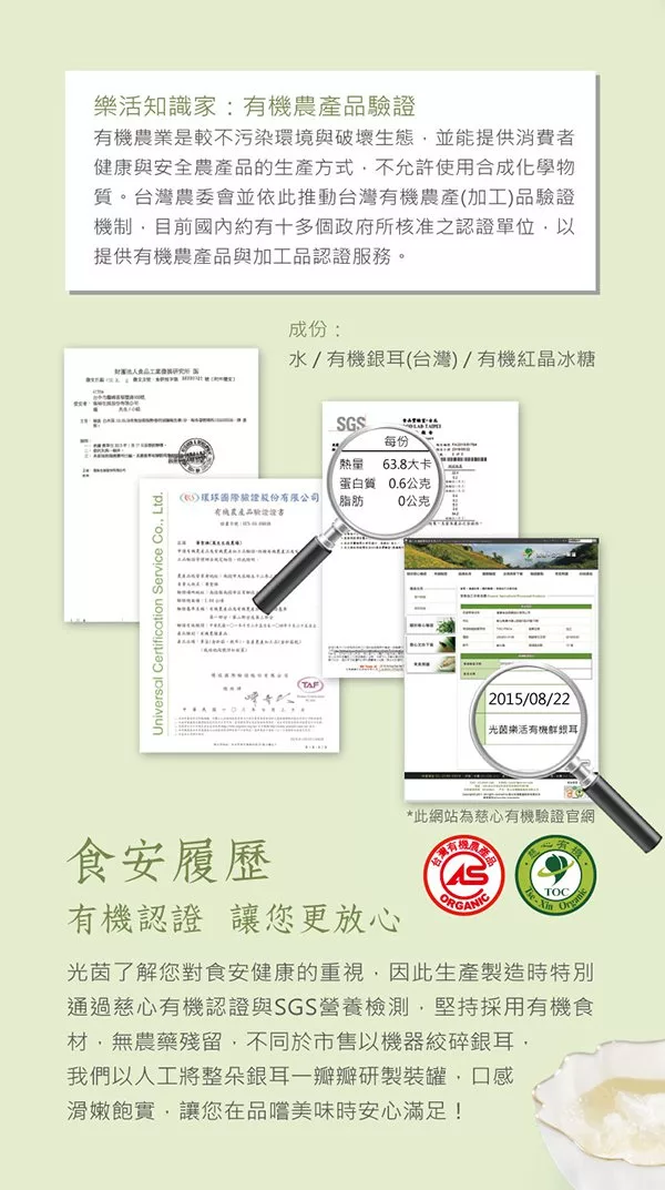 有機鮮銀耳有別於市售的白木耳露,可以吃到整朵的有機銀耳!更像是自家熬煮的冰糖銀耳!從採收、運送到生產完畢把握在24以時內完成,